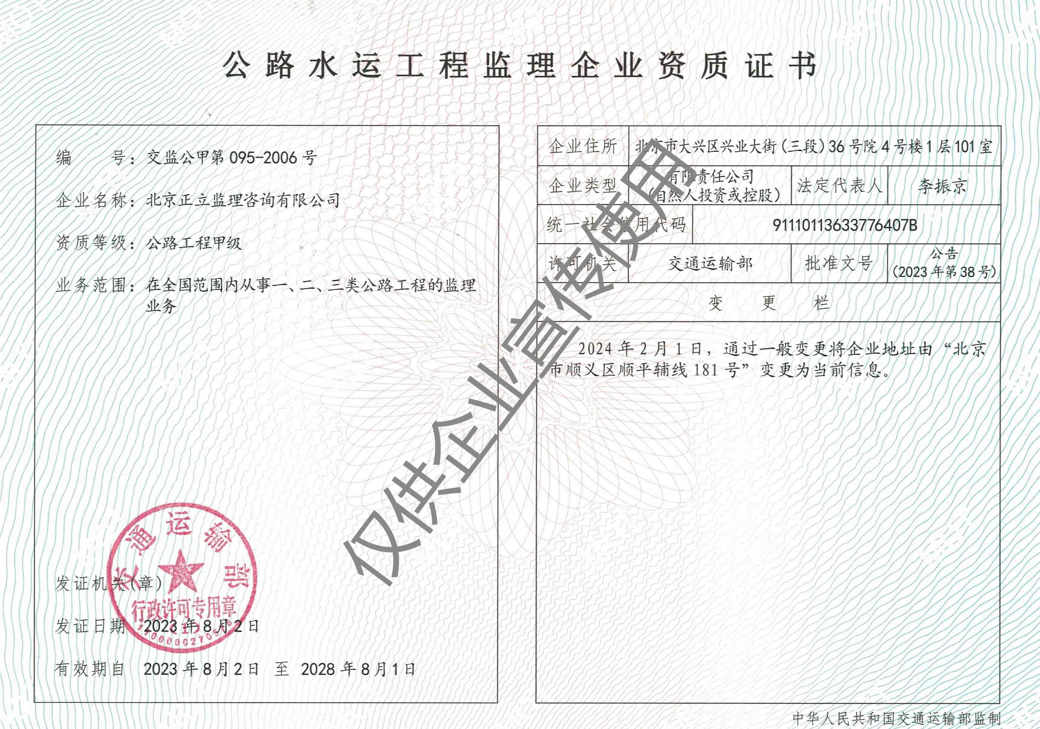 北京正立監(jiān)理咨詢有限公司成立于1998年7月1日,其前身隸屬于北京市公路質(zhì)量監(jiān)理站。具有獨立法人資格,是獨立核算、自負(fù)盈虧的經(jīng)濟(jì)實體。企業(yè)經(jīng)營范圍:公路工程監(jiān)理、交通工程監(jiān)理、市政公用工程建設(shè)監(jiān)理、工業(yè)與民用建筑工程監(jiān)理、工程監(jiān)理咨詢、技術(shù)咨詢、技術(shù)培訓(xùn)等。